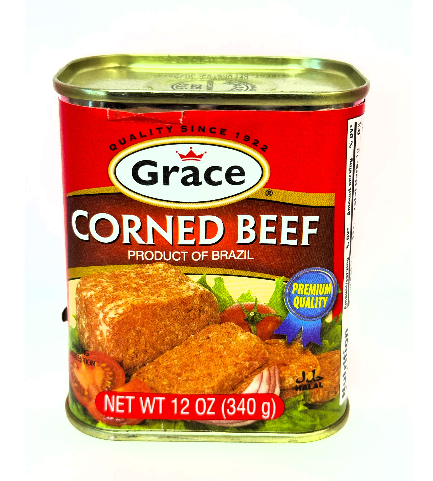 Corned Beef with Juices 12 oz (340 g) Product of Brazil. Chill can before opening. Remove contents and slice with sharp knife. Unused portions should be kept on a plate in a cool place. 12 oz (340 g) Jamaica